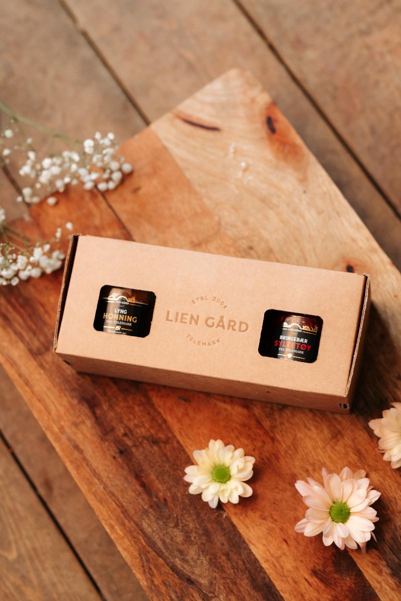 En smakfull gaveeske med tre av gårdens klassikere: honning, eplegé og bringebærsyltetøy. Produktene er pakket i en enkel og stilren gaveeske i naturfarget papp – like fin å gi bort som å unne seg selv.